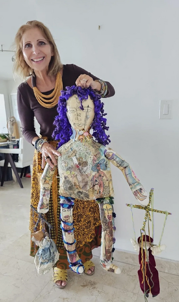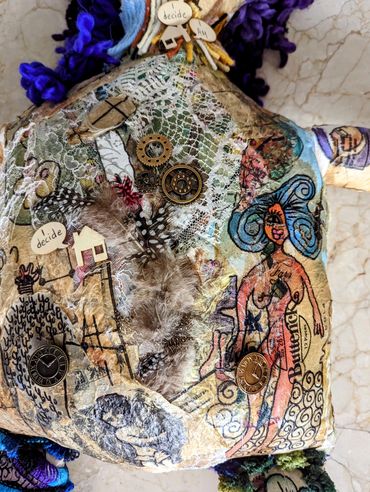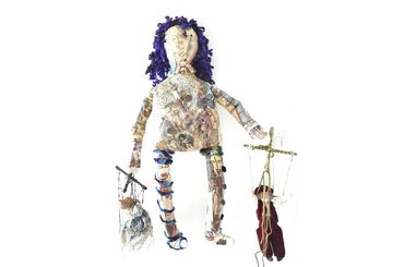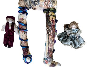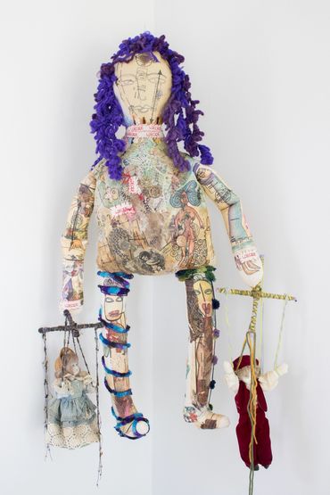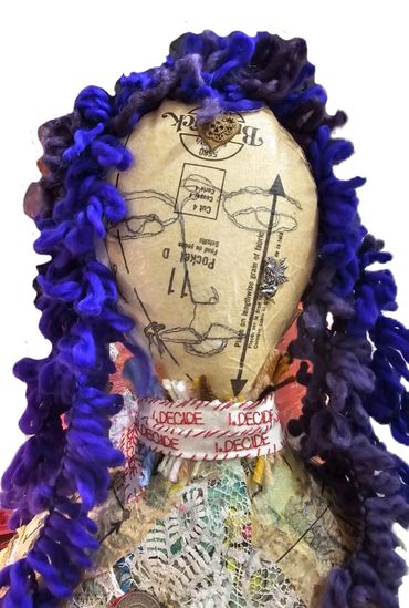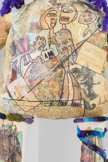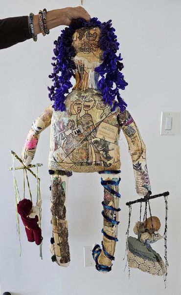 "I Decide" asserts the profound human right to make choices, particularly emphasizing women's autonomy historically restrained by various means. The artwork features a giant rag doll holding two puppets—one resilient, the other traditional. The inscription "I decide" echoes throughout the figure, symbolizing the empowerment of personal choices. Rich with personal and familial artifacts, the doll encapsulates the essence of decision-making. This piece invites contemplation on the freedom and strength found in reclaiming one's power to decide.